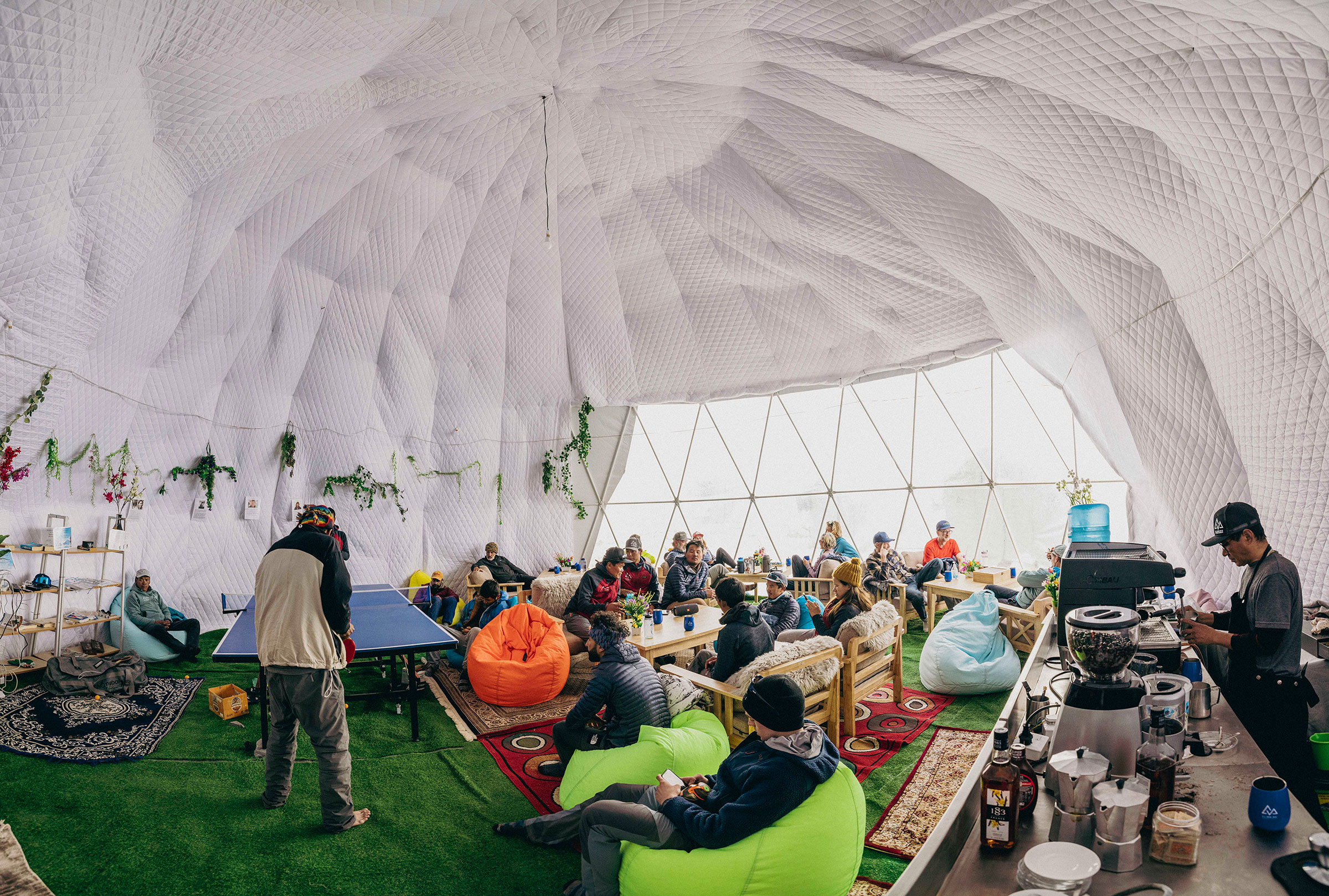 Our campsite sits at the foot of the Khumbu Icefall—impossibly beautiful. Geodesic domes are set up with electricity, proper beds, and heated blankets—luxuries I am glad to have. A chef prepares gourmet meals that I wish I could eat, but at that altitude, I can hardly stomach them. There’s even a tent set up for ping pong (laughable to imagine playing—I can barely make it to the tent!), and a much-appreciated barista making cappuccinos. For those who feel up to it (not me), they also have an ice-climbing clinic on the glacier.