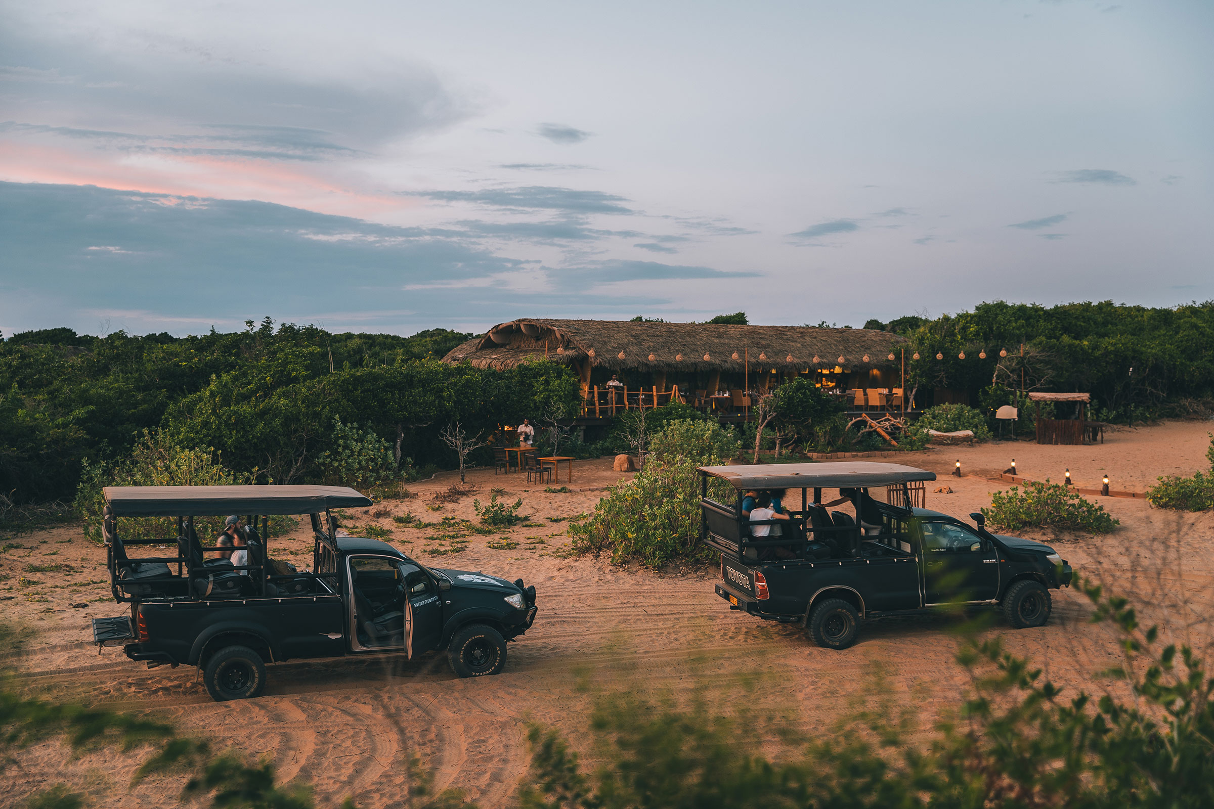 On my first night at Uga Chena Huts just outside Yala National Park, we come across a lone elephant tugging shrubs from the dry earth, effortlessly feeding himself with his powerful trunk. The massive bull calmly approaches our safari vehicle, curious about the quiet observers interrupting his dinner. I sit in awe, humbled by the sheer presence of such a majestic creature. Later, as we enjoy sundowners by the lagoon, the sky shifts from fiery pinks and oranges to a deep indigo, revealing a dazzling stretch of Milky Way stars—a moment that deepens my reverence for the natural world.